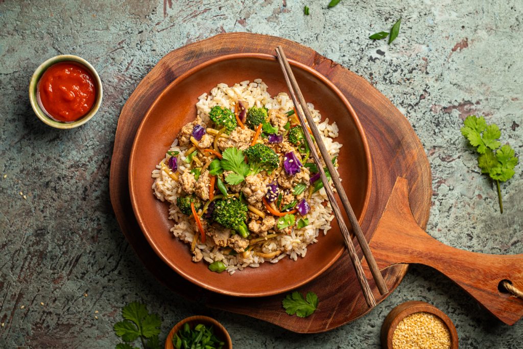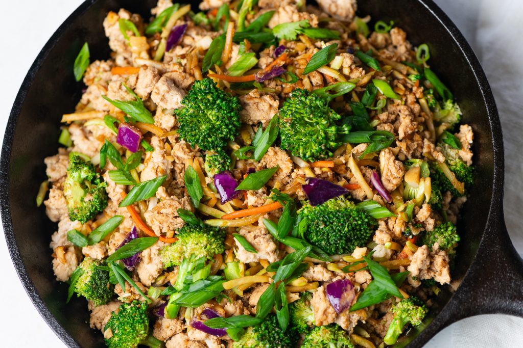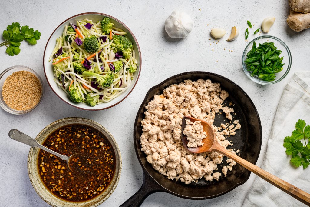 All the savoury, sesame-ginger goodness of an egg roll—no wrapper required. This recipe brings together lean Alberta chicken, broccoli slaw, garlic, ginger, and Tamari for a quick, one-pan dinner that’s colourful and filling.