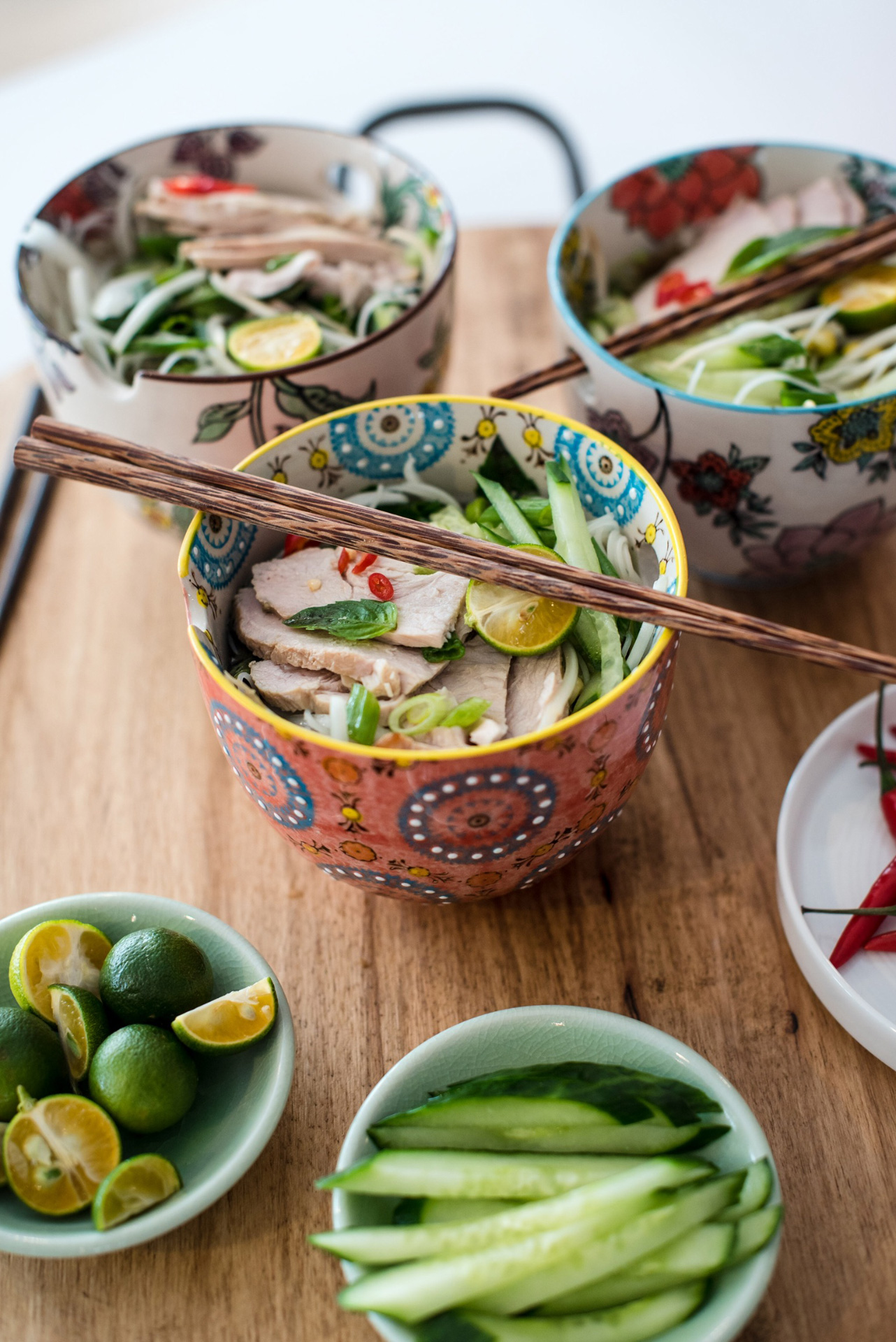 Next, Cela and chef get hands on to assemble our Turkey Pho soup, layering the dangling noodles crunchy bean sprout and cucumbers, aromatics and our roasted turkey meat. We top the final dish with hot chili slices, something I never shy away from as a parent. By allowing your kids to experience the kick of a hot spice, we elevate their taste sensation. This is a perfect recipe to share, and a lot of fun to put together.